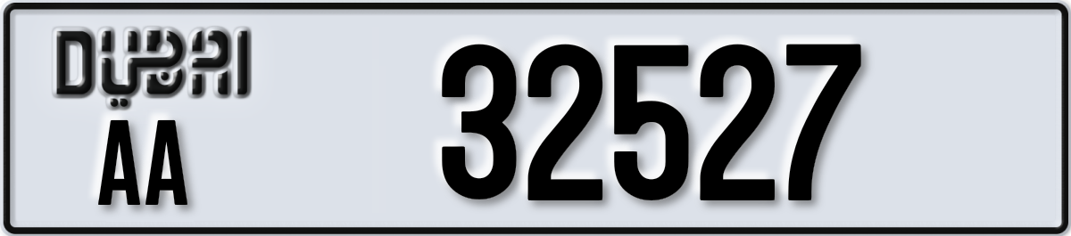 Dubai plate number AA 32527 listed on PL8. Status: available.