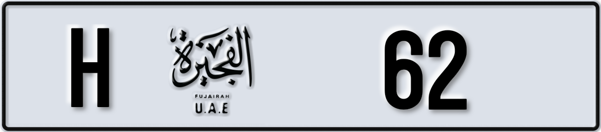 Fujairah plate number H 62 listed on PL8. Status: available.
